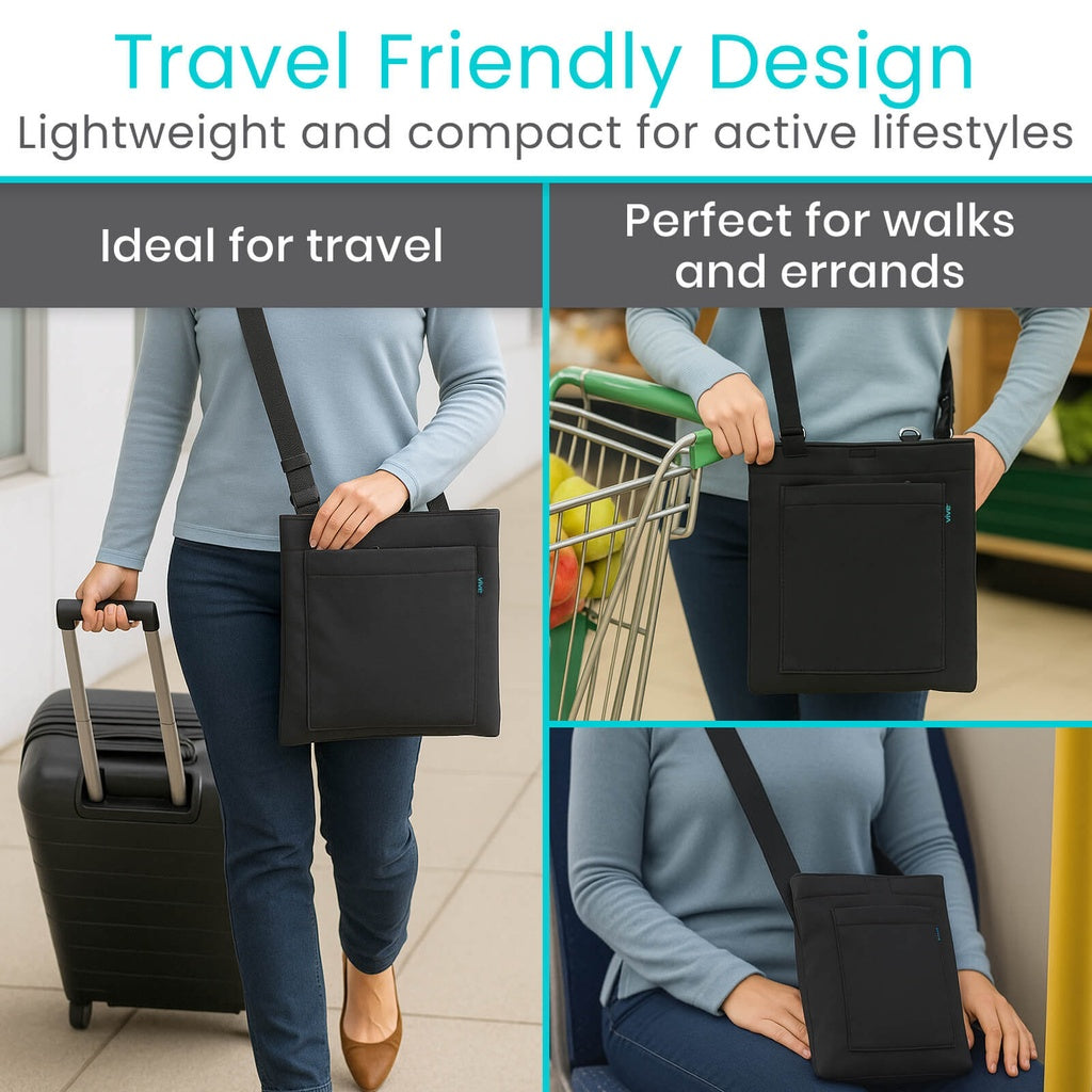 The Vive Catheter Bag Holder is a practical solution for discreetly managing urinary drainage bags during daily activities. Constructed from durable 100% polyester, this compact holder measures 11.5" W x 12" L and weighs just 1.18 lbs, making it lightweight and portable. The package includes the holder plus an adjustable shoulder strap for flexible carrying options. Its neutral black design seamlessly integrates into any setting while keeping drainage systems fully concealed. Easy maintenance is built in—simply machine wash on low with mild detergent and cool water, then air dry. Ideal for individuals seeking privacy and accessibility in catheter care management.